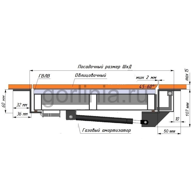 Конструкция смещенного за ось шарнирного соединения убирает щель над петлей, не скрадывая размер проема в чистоте 1050х500.