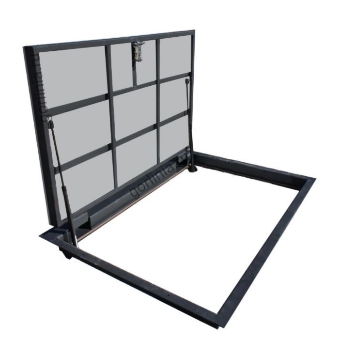 Заполнение двери: гипсокартонный влагостойки лист под облицовку отделочным материалом. После наклейки плитки с соблюдением рекомендаций завода-производителя механизм становится невидимкой в напольном покрытии.