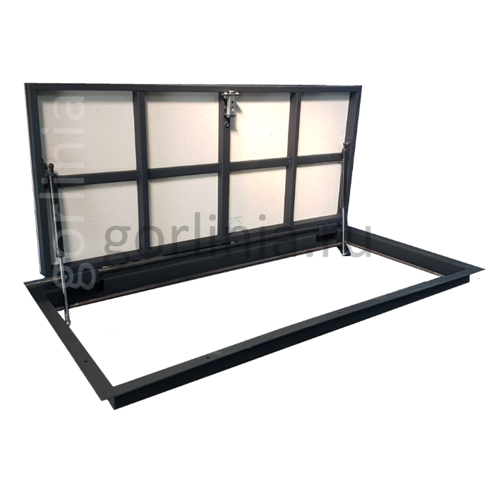 Нестандартная прямоугольная форма с шарнирным механизмом по длинной стороне, зауженным лазом в подполье 750*500.