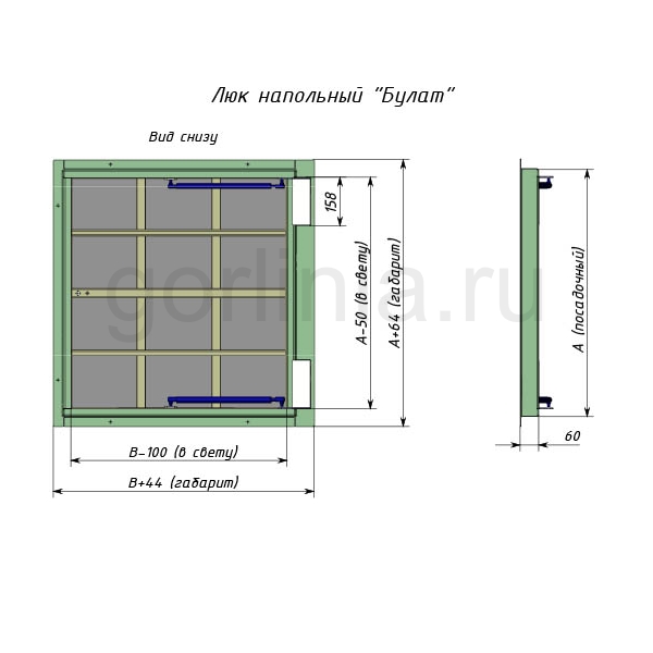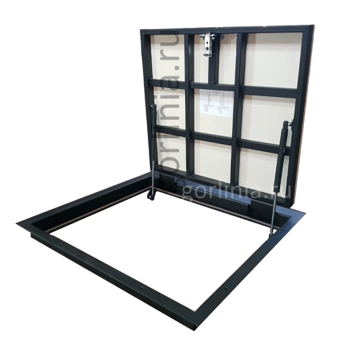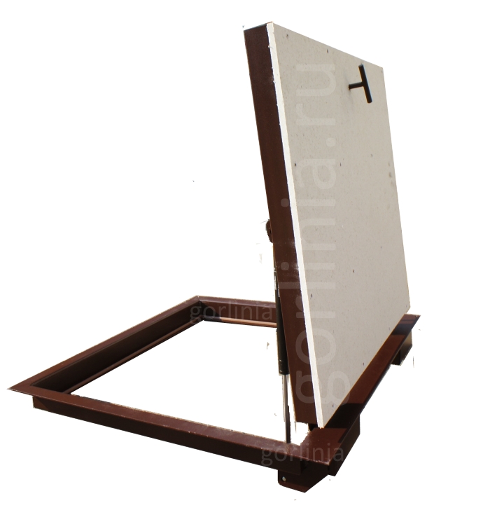 Облегченная модель без щелей в полу с уведенными за ось открывания петлями. Легкая ходовая часть и удобная установка. Просторный размер в свету 750*600 при поднятой крышке для удобного спуска по лестнице в подвальное помещение. При формировании посадочного отверстия обратите внимание, что защитные кожухи шарниров выходят за посадочную отметку по плечевой стороне (см фото).