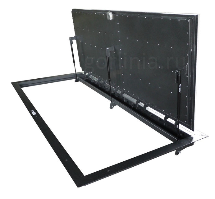 В закрытом положении дверка опирается на трубу 15х15 по трем сторонам, по петлевой держится на осях подшипника шарниров. Уплотнитель проложен по четырем сторонам. Снизу щель над петлями закрыта специальным поддоном для предотвращения тяги холодного воздуха из подвала. Люк предназначен под бытовые нагрузки - уверенно держит проход человека.