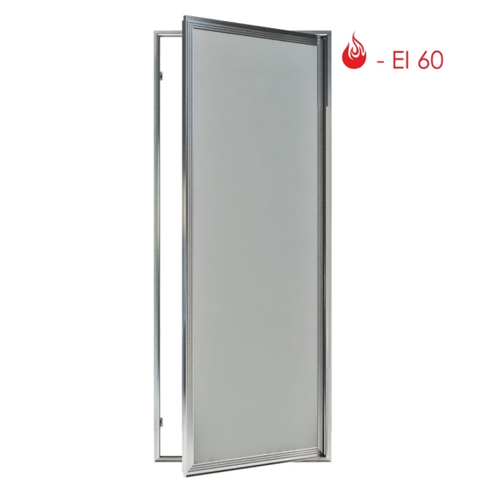 Створка распашная, открывается на себя на опорных подшипниках осевых петель. Заполнена листами ГВЛ и ГСП-DF с минватой в полости. Класс огнестойкости EIS 60. Сертифицировано.