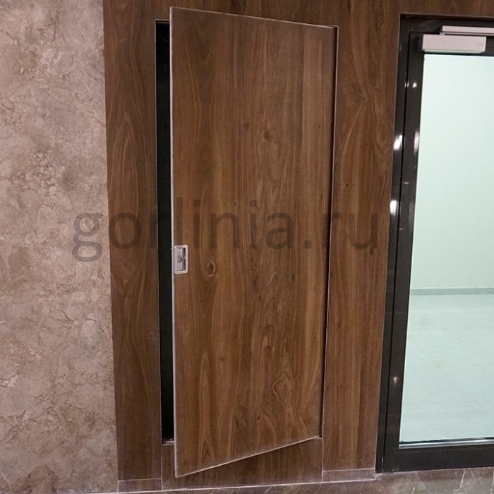 Лицевая часть полотна зашита влагостойким гипсоволокнистым листом в один слой, проложена минеральная плита плотностью не менее 150 кг/м³, подшита с тыльной стороны вторым слоем огнестойкого гипсоволокна ГСП-DF. По контуру рамы проложен терморасширяющийся дверной уплотнитель.