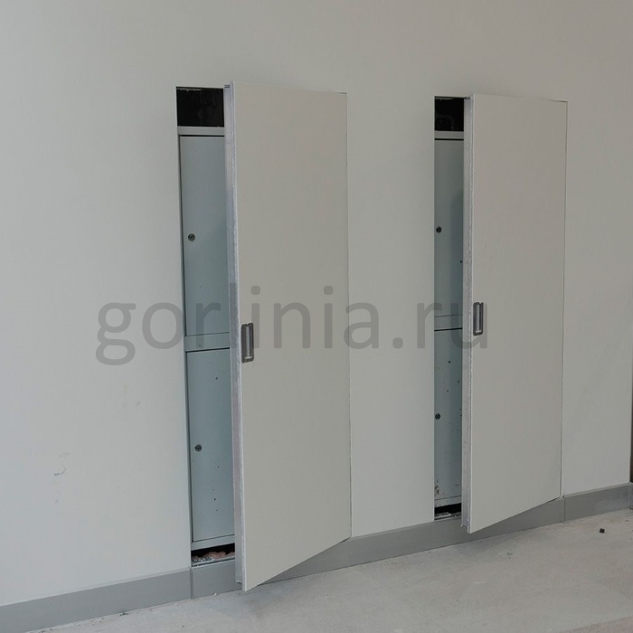 Монтажный размер скрытой коробки из алюминиевого профиля 600х1600х62 мм. Полотно 552*1552 заполнено 2-мя листами влагостойкого гипсоволокна "Knauf", внутри проложена минеральная вата. По контуру притвора в раме проклеена терморасширяющаяся лента.
